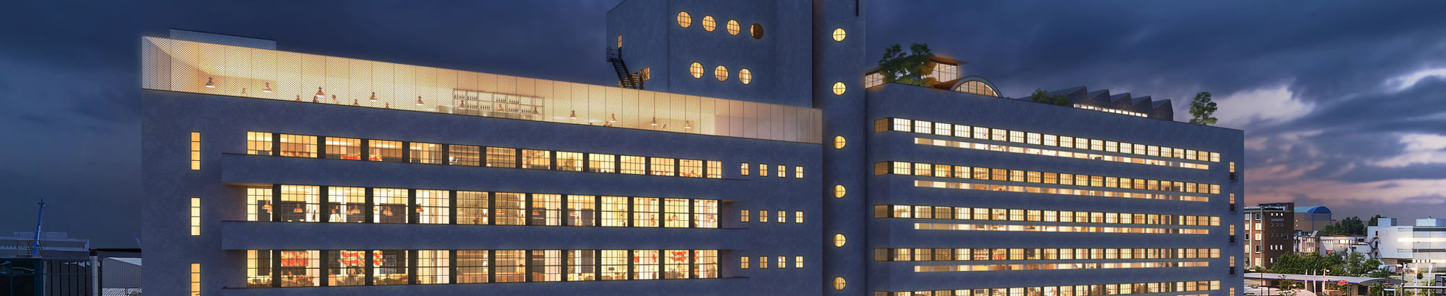 The program is carefully and flexibly integrated into the existing structure, respecting the former offices on one side and the factory on the other side. Hospitality and congress facilities activate the bel-etage plinth, reintroducing public life to the lower levels. The former silos are repurposed to house vertical circulation and create striking new office spaces. Volumes have been added to the rooftop in line with the original design intent of architect Mertens.
